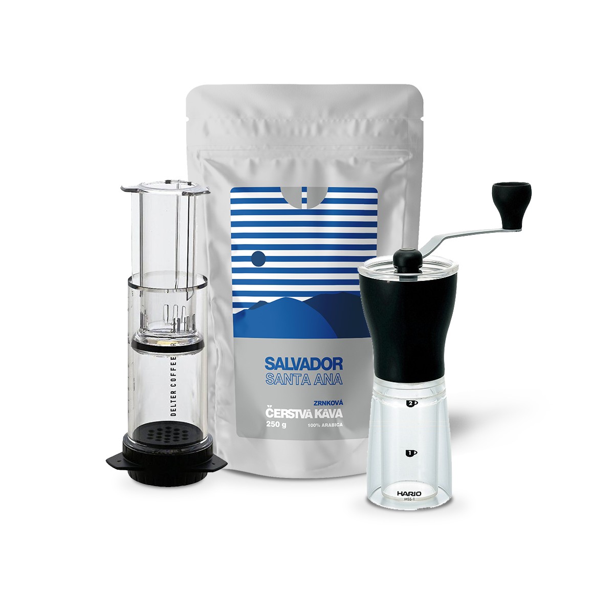 Příprava kávy s Delter Coffee Pressem zaujme každého, kdo si rád hlídá chuť své kávy. Díky kontrole dávkování vody a možnosti lépe dohlédnout na extrakci si každý připraví kávu přesně podle sebe. Delter Coffee Press získal v roce 2019 australskou cenu Good Design a potěší všechny milovníky nových cest se smyslem pro detail. Dalším pomocníkem v sadě je Hario Mini Mill Slim, který je jedním z nejprodávanějších ručních mlýnků. Zákazníky na celém světě okouzlil svým praktickým tvarem, snadným použitím a rozměry, díky nimž se skvěle hodí třeba na cesty.
